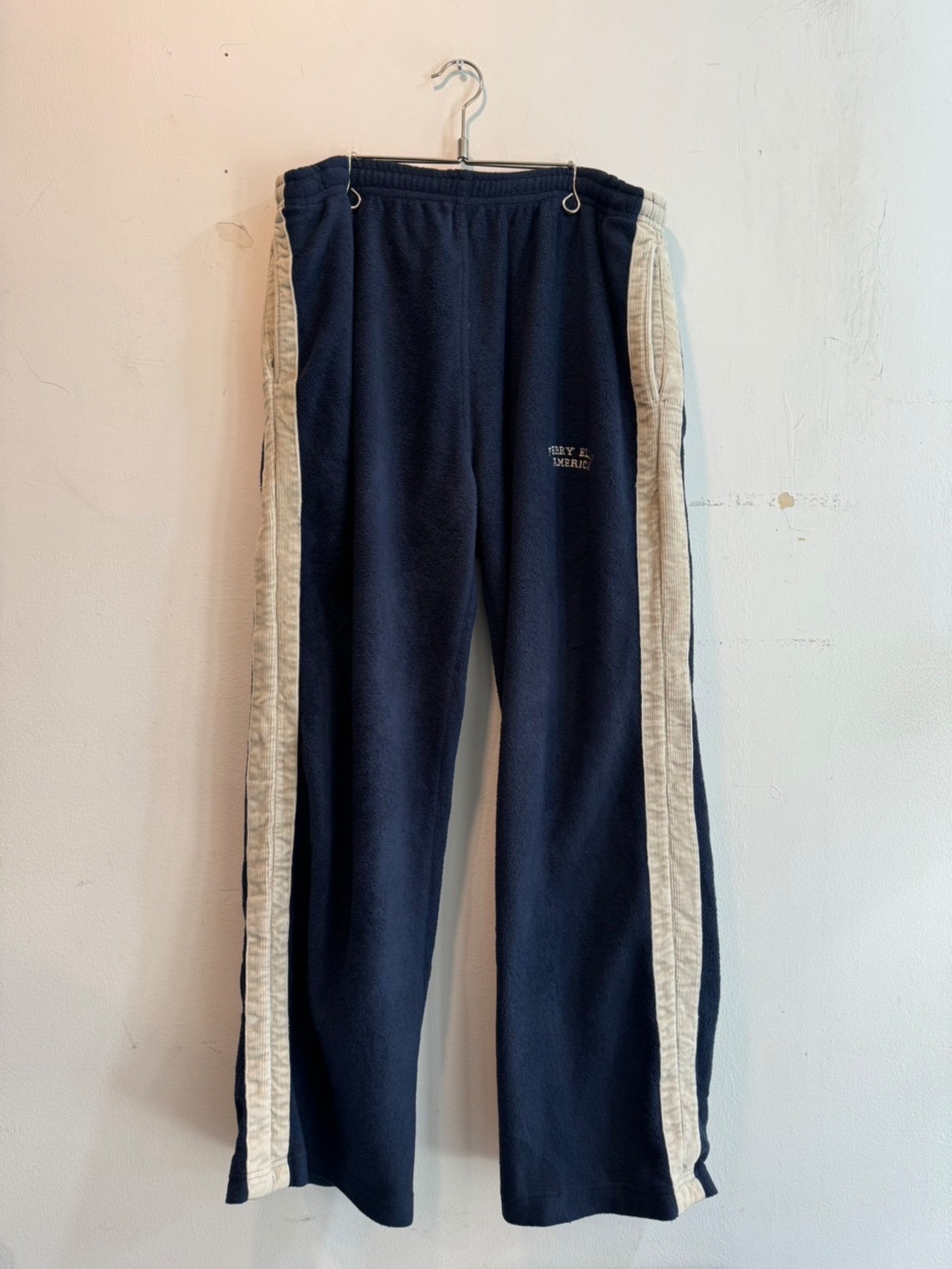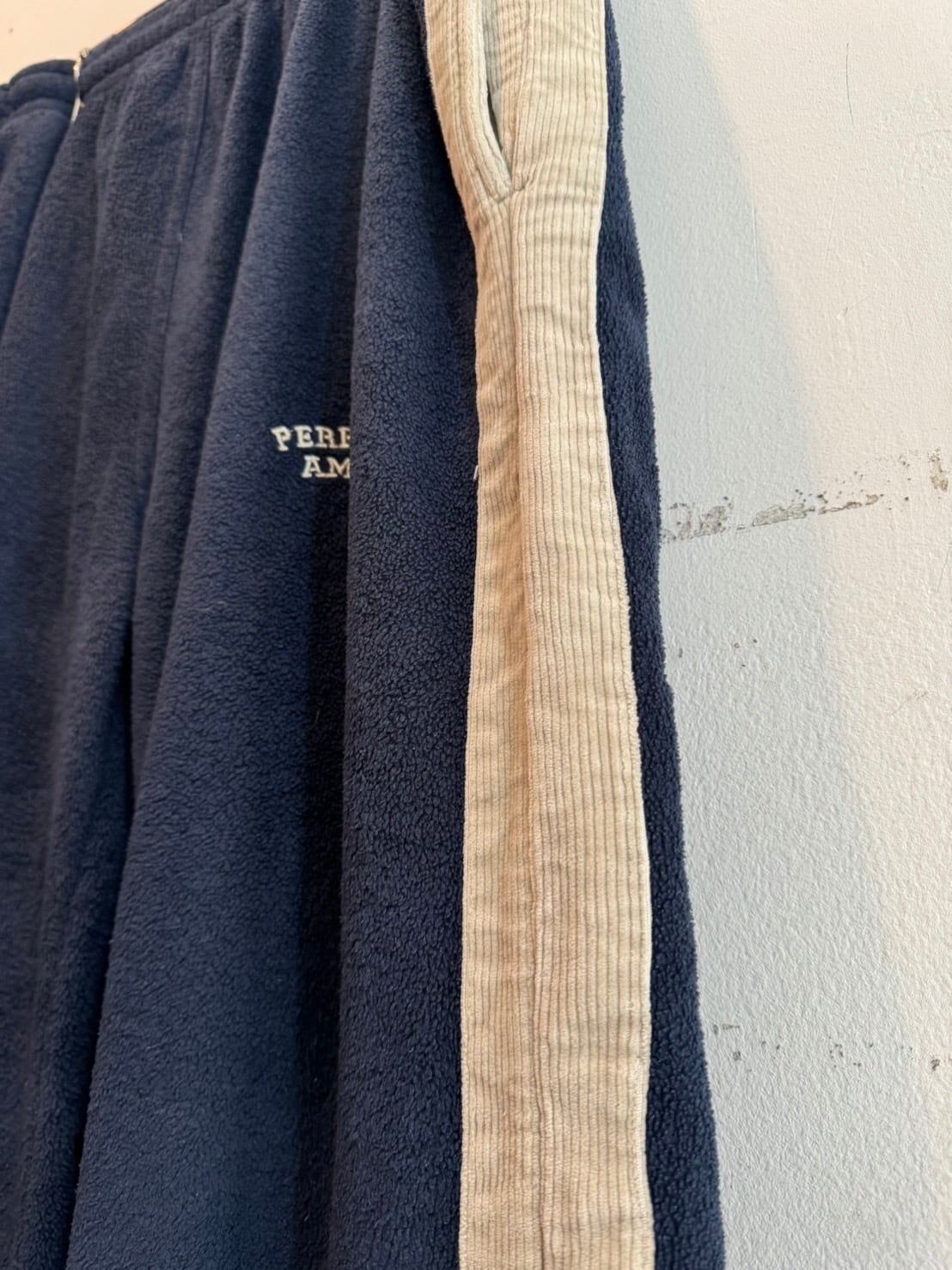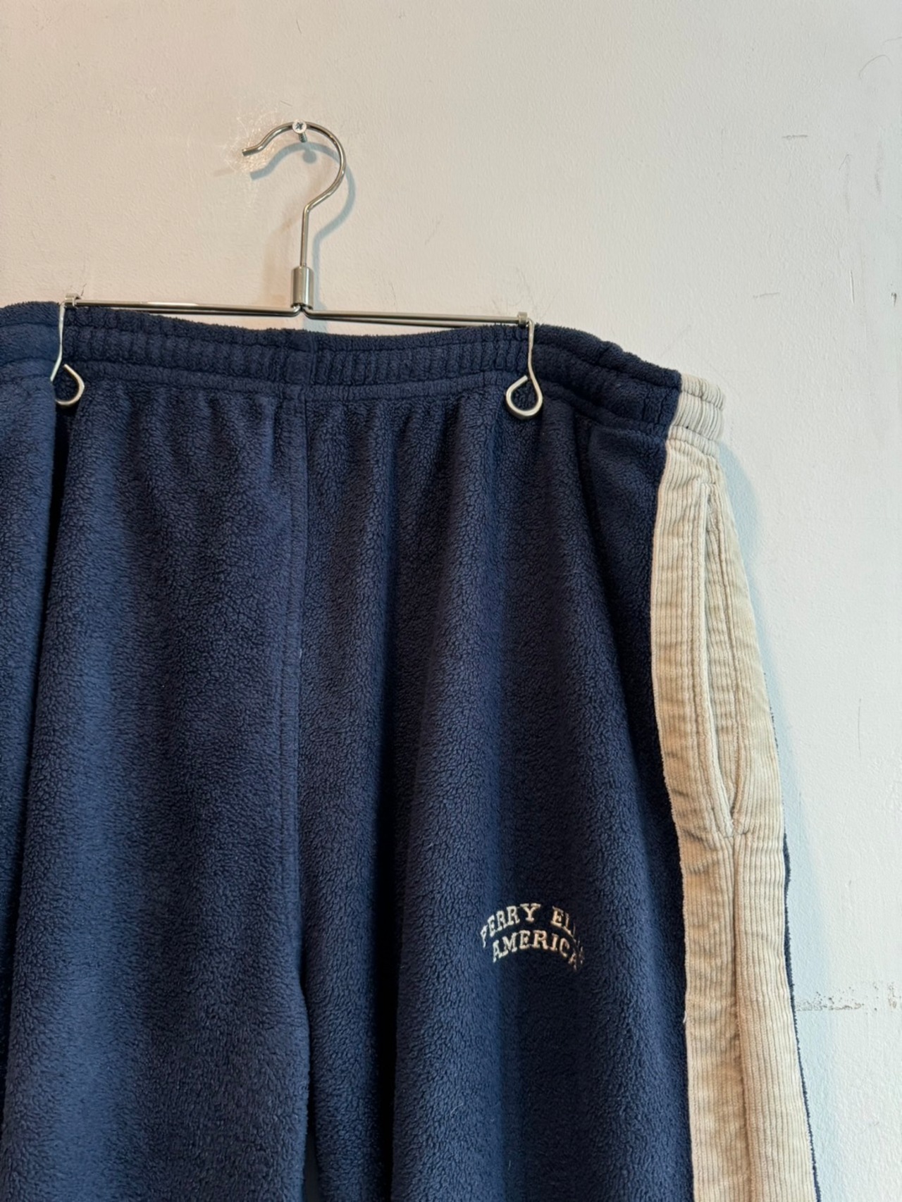 ネイビーのフリース生地にコーデュロイのサイドライン切り替えが洒落たデザイン