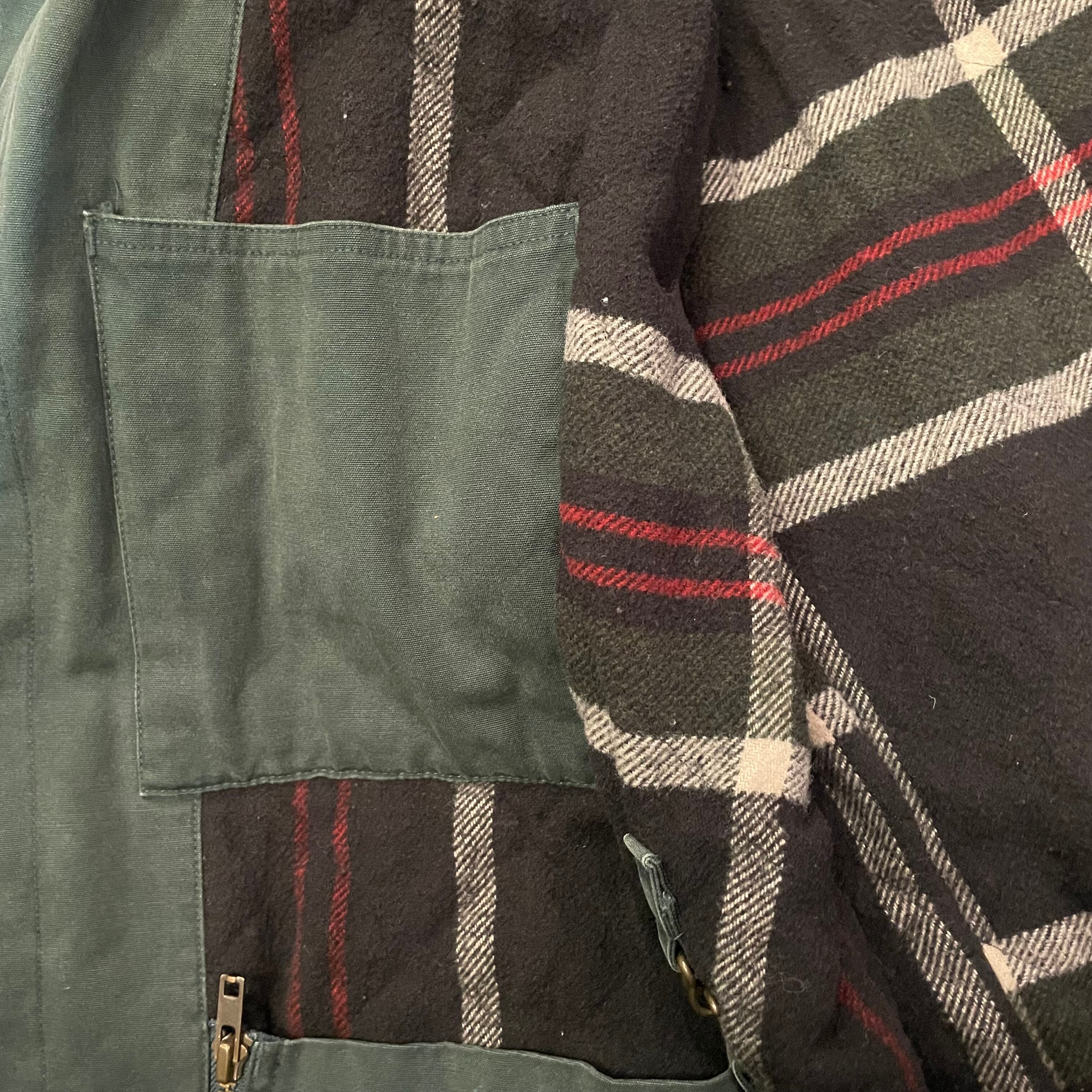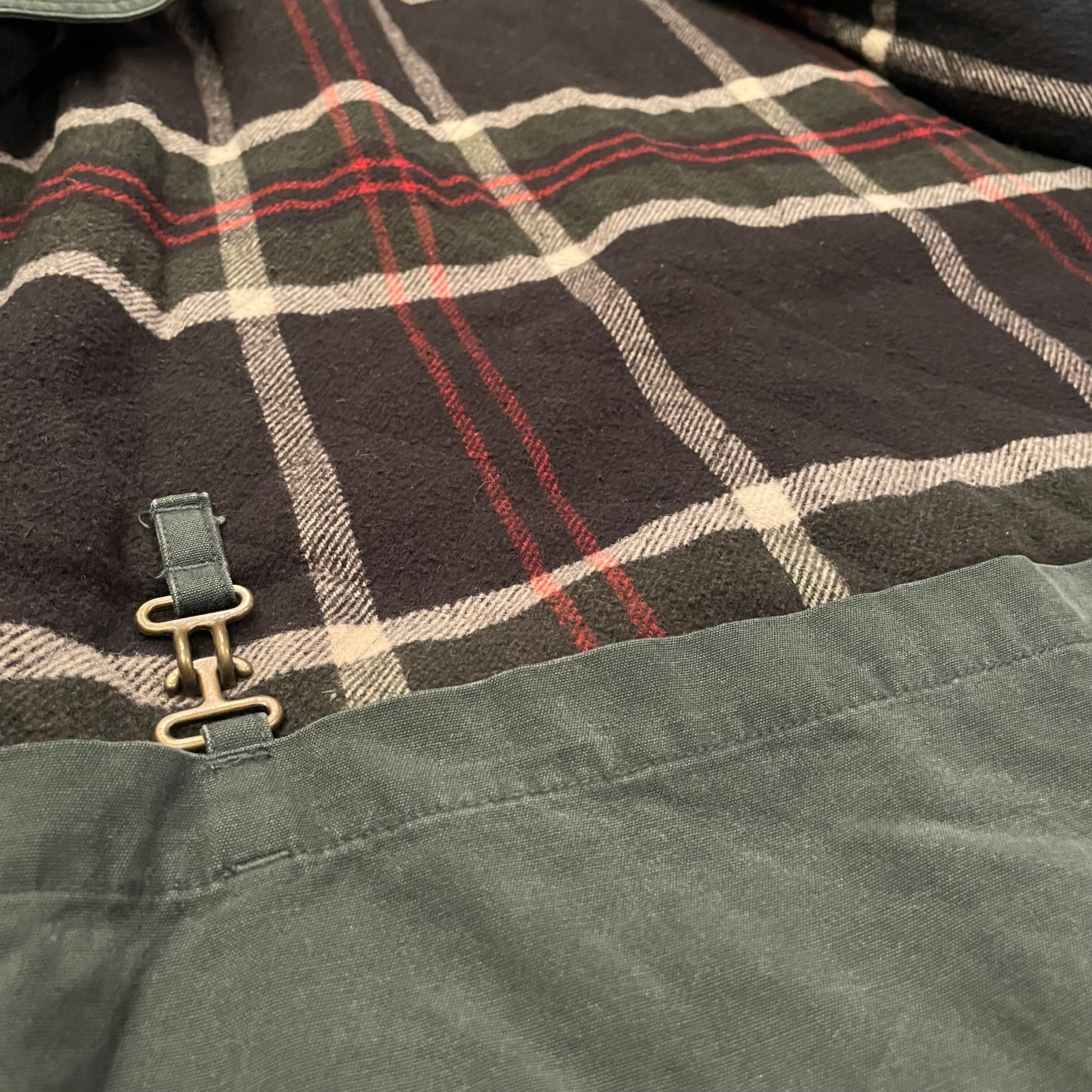 モスグリーンの色味に裏地のチェックのライニングがとても良いコントラストです
