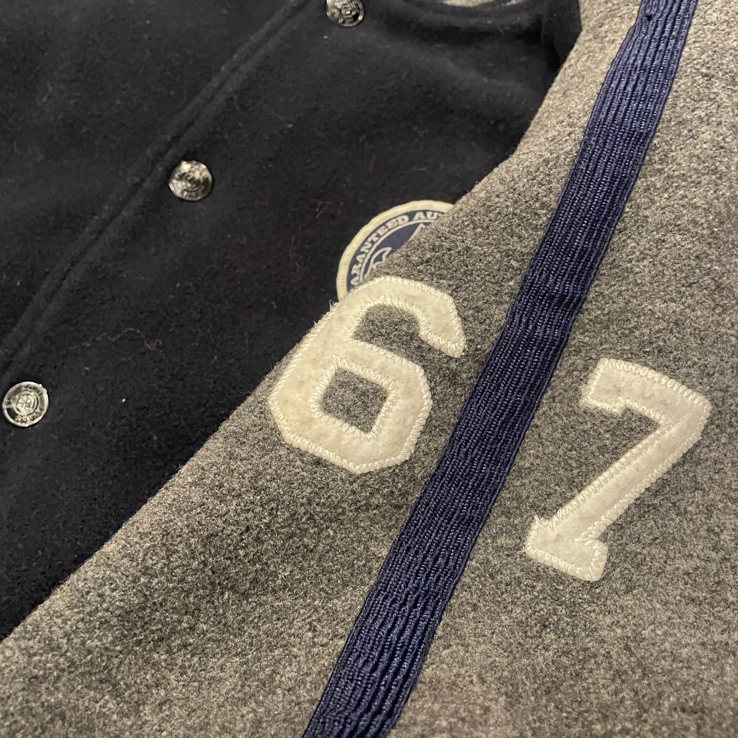 ワッペンから刺繍まで豪華仕様でネイビー×グレーの好配色バーシティジャケット